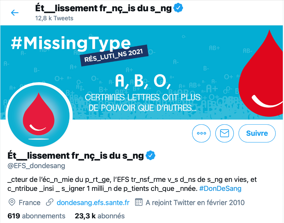 Lâ Ăt__lissement fr_nç_is du s_ng _lerte sur les nive_ux trĂšs inquiĂ©t_nts des rĂ©serves de s_ng, _l_rs qu’il _ l_nce lundi 4 j_nvier s_ c_mp_gne de sensi_ilisation #MissingType. PrĂšs de 1 000 d_ns ser_ient nĂ©cess_ires d_ns l_ rĂ©gi_n H_uts-de-Fr_nce, l_ dem_nde de d_nneurs est perm_nente. Le h_sht_g #MissingType _ f_it disp_r_itre les lettres a, b et o p_ur sensi_iliser le plus gr_nd n_m_re sur le risque liĂ© _u m_nque de s_ng.