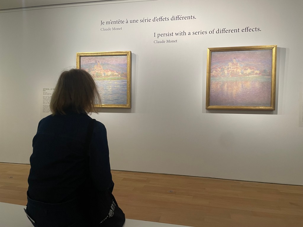 Composée de six œuvres, l’expérience commence dans une vaste pièce tamisée. L’exposition retrace la vie de Claude Monet à Vétheuil, une commune d’Île de France, que l’artiste peignait souvent. On peut retrouver en toute intimité, les œuvres de l’artiste représentant les paysages du village. Vétheuil, le matin et Vétheuil, soleil couchant se retrouve exposée l’une à côté de l’autre. Ces deux œuvres, similaires par leur paysage, font partie d’une collection de 15 peintures à l’huile représentant ce village du Val-d’Oise à plusieurs moments de la journée.
