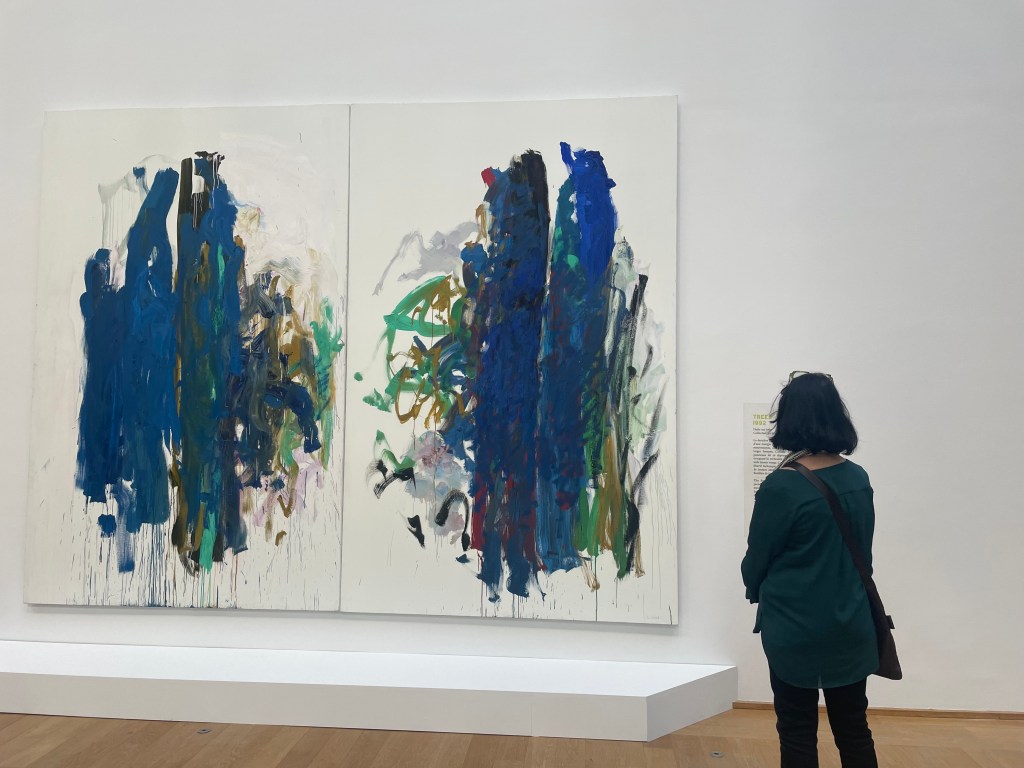 100 ans plus tard, Joan Mitchell, peintre américaine, s’installe en France à Vétheuil. Dans sa propriété, rue Claude Monet, elle découvre le terrain où le peintre avait vécu. Souvent comparé à cet artiste du 19ème siècle, Joan Mitchell travaille l’art abstrait. À l’occasion de cette exposition, trois œuvres de l’artiste sont exposées au musée. Trees et Champs représentent les paysages de Vétheuil dans les derniers moments de sa vie.