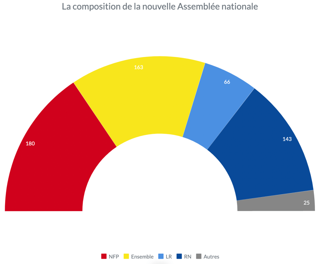 Dimanche, le résultat des élections législatives est tombé. Et c’est le nouveau front populaire qui arrive en tête avec 180 sièges sur 577 à l’Assemblée nationale. En deuxième position c’est Ensemble, la majorité présidentiel, qui récupère 163 sièges. Et alors que tout le monde les attendait en première position, le Rassemblement National fini à la troisième place avec 143 siège.