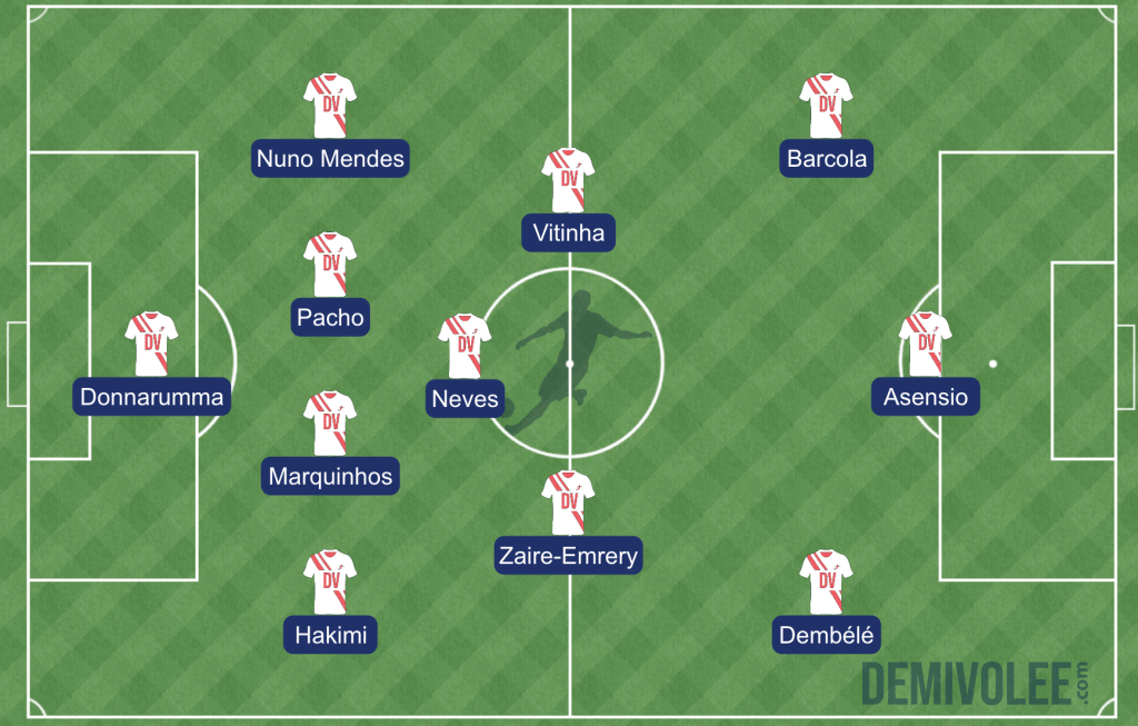 Luis Enrique ne devrait pas changer sa composition de d’habitude. Gianluigi Donnarumma devrait être épaulé par la même défense que d’habitude : Nuno Mendes, Willian Pacho, Marquinhos et Achraf Hakimi. Le milieu de terrain devrait lui aussi rester le même avec João Neves, Vitinha et Warren Zaïre-Emery. En attaque, les ailiers seront Bradley Barcola et Ousmane Dembélé.