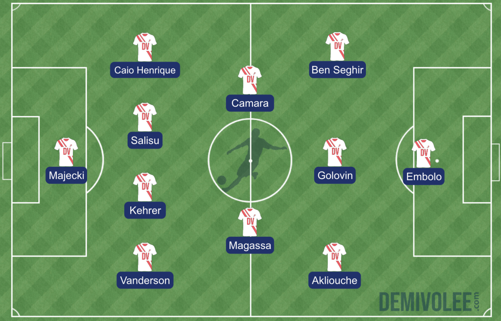 Radoslaw Majecki sera le gardien du club de la principauté, accompagné de Vanderson, Thilo Kehrer, Mohammed Salisu et Caio Henrique en défense. Le milieu de terrain sera composé de Soungoutou Magassa et de Lamine Camara. Pour l’animation offensive, les couloirs seront animés par Maghnes Akliouche et Eliesse Ben Seghir. Enfin, Aleksandr Golovin sera là pour distribuer de bons ballons à Breel Embolo.